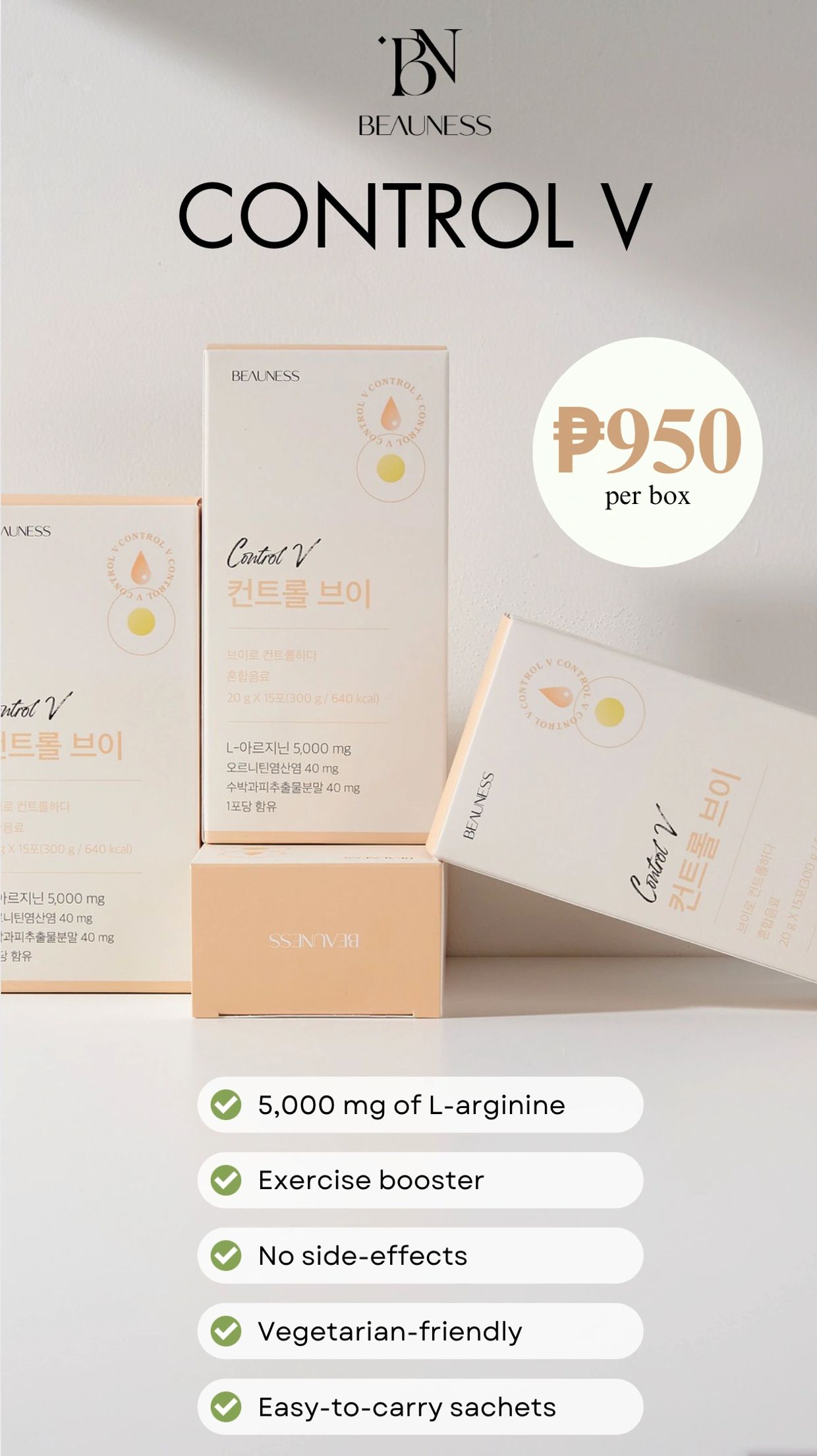 Control V is an energy and stamina booster that contains L-arginine (5,000mg), L-Ornithine, watermelon seedcase extraction powder (L-Citrulline). This energy booster helps improve blood circulation and improves accumulated edema and swelling, making one's body feel lighter. Such effects can be felt within a short period of time after consumption.